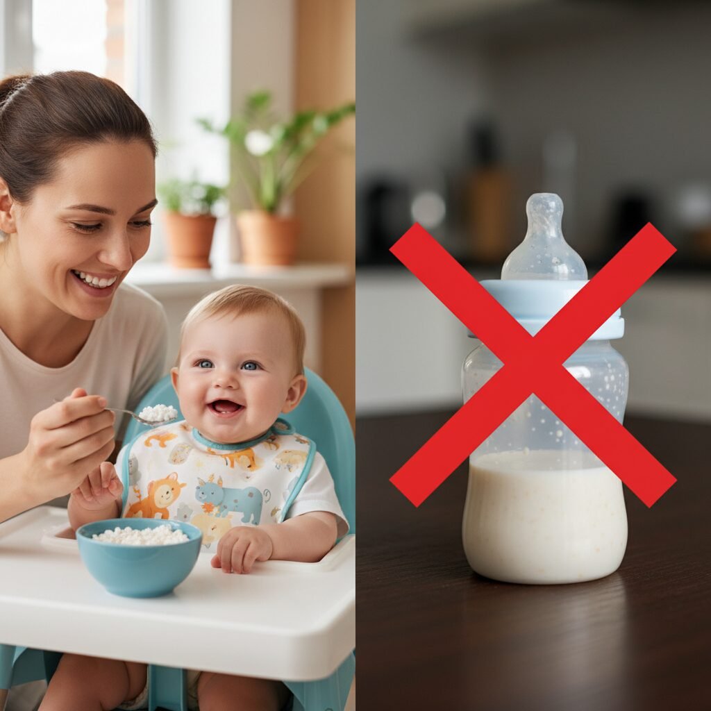Firstly, adding cereal to a bottle is a significant choking hazard. The thickened liquid can be difficult for a baby to swallow safely. Secondly, it can lead to overfeeding and excessive weight gain, as the baby may consume more calories than they need. And the truth is, it’s a myth that it helps them sleep longer. A baby’s sleep patterns are developmental; they are supposed to wake up frequently to eat. It’s a survival mechanism. Solids should be introduced around 6 months of age, with a spoon, when they show signs of readiness.