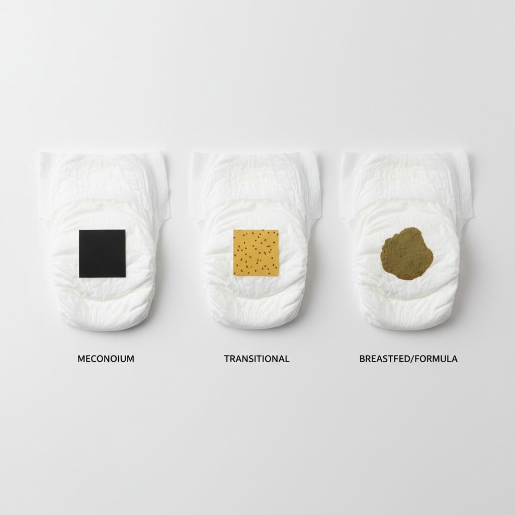 • Black/Tarry: This is called meconium, and it’s your baby’s very first poop. It’s made up of everything they ingested in the womb (amniotic fluid, mucus, skin cells). It should pass within the first 24-48 hours.