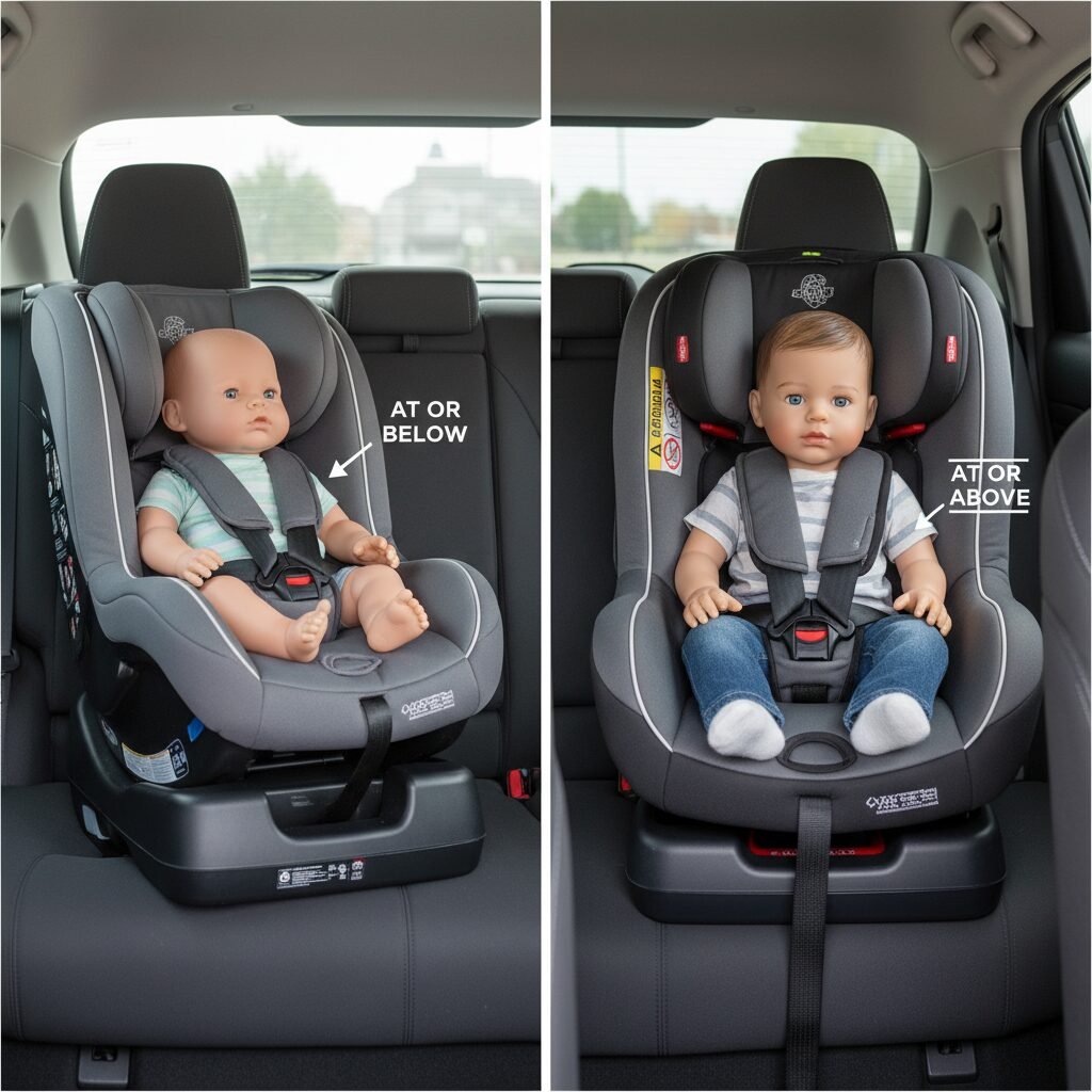 - For Rear-Facing Seats: The harness straps must come from a slot that is at or just below your baby’s shoulders. In a frontal crash (the most common type), this positioning helps cradle your baby and keep their body from sliding upwards in the seat. If the straps are too high, their little body can launch upward, putting immense pressure on their neck and spine.