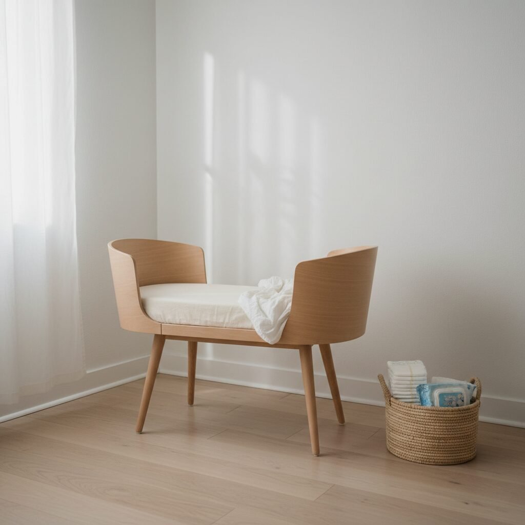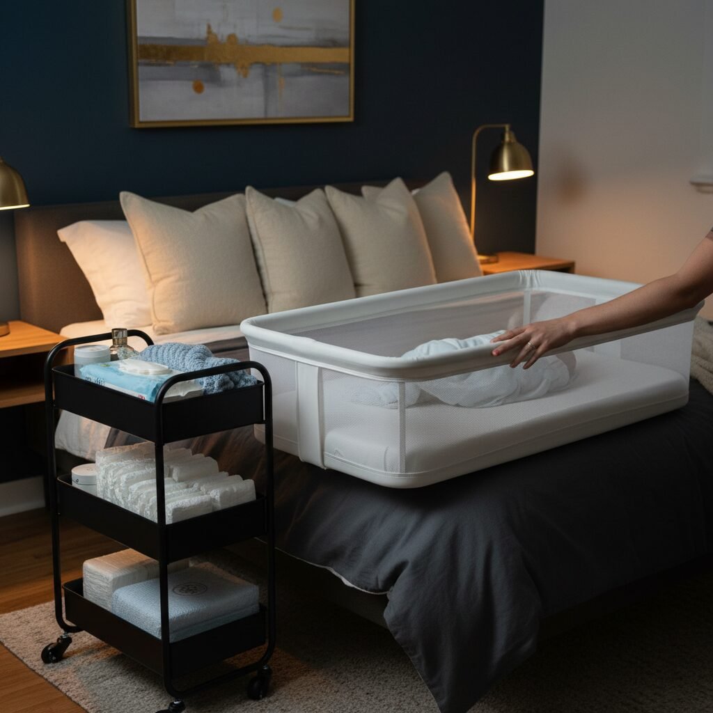 What are the true essentials for a bedroom nursery? A safe place for baby to sleep, a place to change them, and a place to store their immediate necessities. That’s it. For this layout, you’ll have a bassinet or mini-crib, a changing pad that can be placed on your bed or the floor (on a waterproof mat), and a small cart or a few baskets for supplies. No bulky furniture, no extra gadgets. Just the basics.