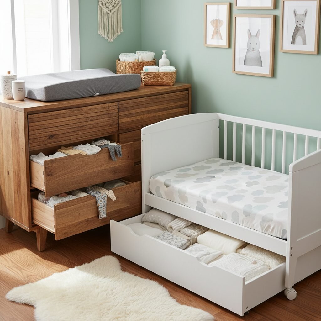 The star of this layout is often the dresser. Instead of buying a separate changing table (which has a very short lifespan), use a sturdy, waist-high dresser. Secure a contoured changing pad to the top, and store all your diapering supplies in the top drawer. Voila! You have a changing station and clothing storage all in one. Another hero is the crib with built-in storage. Many modern cribs come with large drawers underneath, perfect for stashing extra sheets, sleep sacks, and blankets, keeping them out of sight but easily accessible.