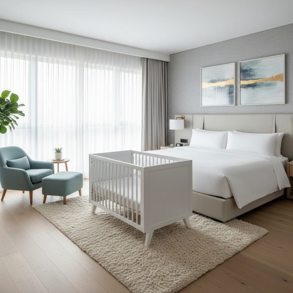 This arrangement works particularly well in long, narrow bedrooms. You can place the crib flush against the wall or against the footboard of your bed. Pair it with a small, comfortable accent chair in the corner for feedings, creating a self-contained little zone. This layout also provides a clear line of sight to your baby from your pillows, which is incredibly reassuring for anxious new parents.