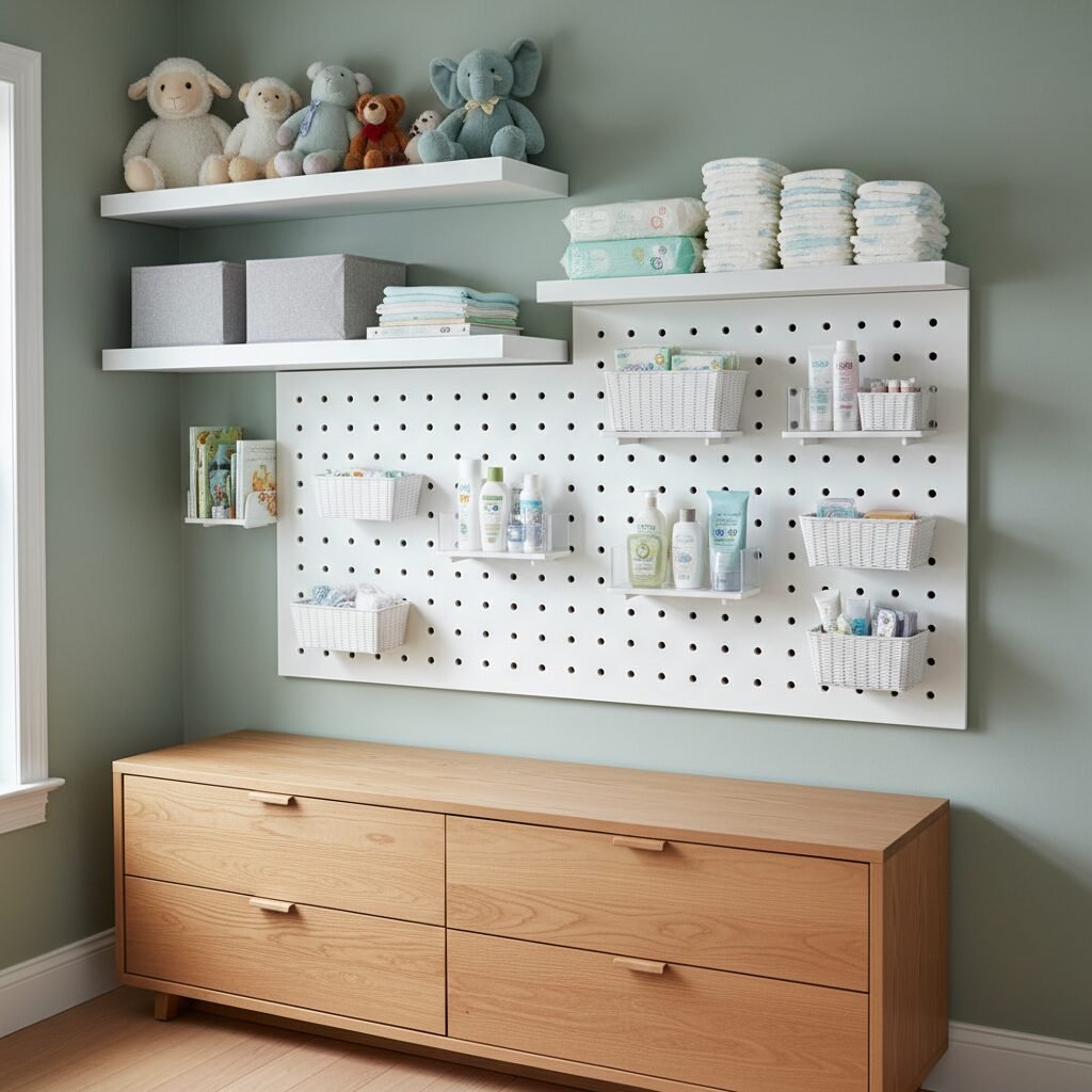 Start by installing a set of sturdy floating shelves above the dresser or in an empty corner. Use these for things you don’t need to access constantly, like extra baby wipes, books, or decorative items. Below them, consider a pegboard system—it’s not just for garages! You can use hooks and small baskets on a pegboard to organize diapering supplies, pacifiers, and grooming tools. Wall-mounted book ledges are another fantastic way to display cute board books without taking up surface space.