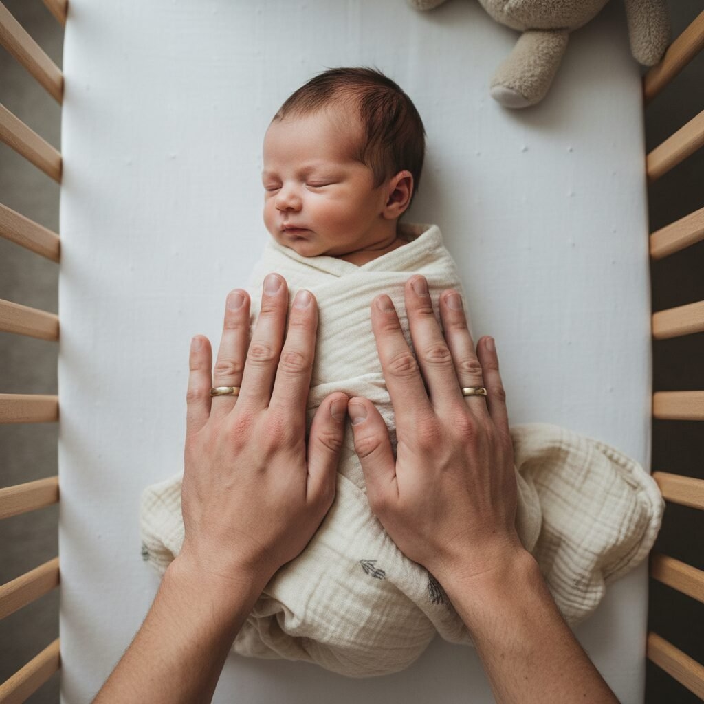 - Step 1: The Heavy Hand. After laying your baby down (drowsy but awake), place one hand firmly but gently on their chest and the other on their tummy or legs. The steady pressure is very calming and prevents them from feeling like they’ve been ‘dropped.’ Don’t pat or jiggle; just apply still, comforting pressure.