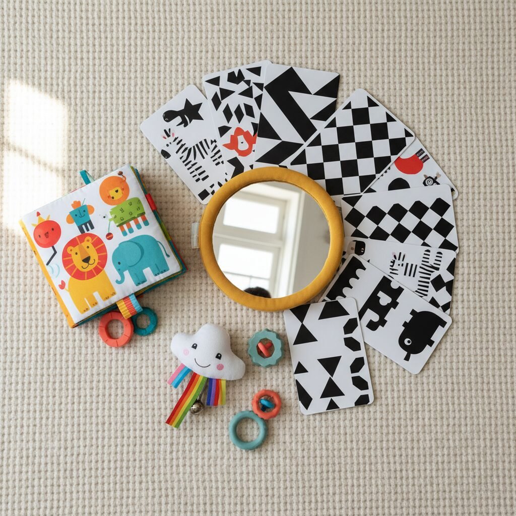 - High-Contrast Cards: Simple black, white, and red flashcards or board books are incredibly engaging for young infants. Prop one up in front of them and watch them stare.