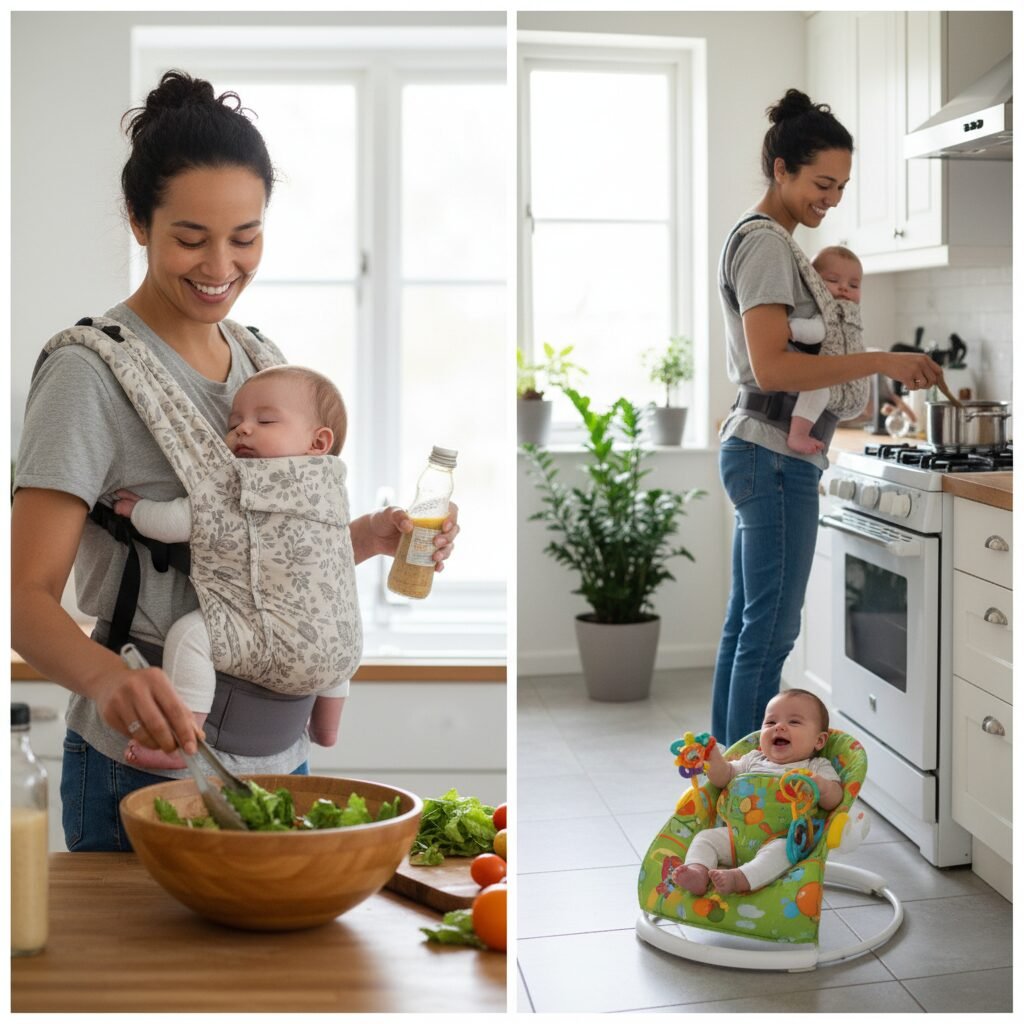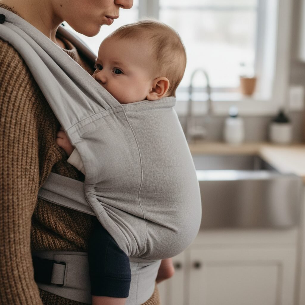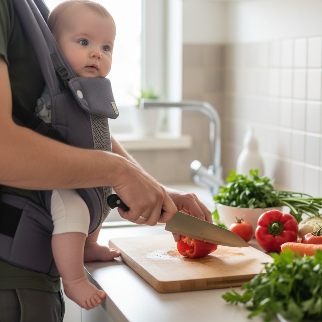 For new parents, I often recommend a soft-structured carrier (SSC) for kitchen use once your baby fits securely. The lack of dangling fabric and the secure, buckled fit provide peace of mind. Whatever you choose, make sure you are 100% confident in using it before you start multitasking.
