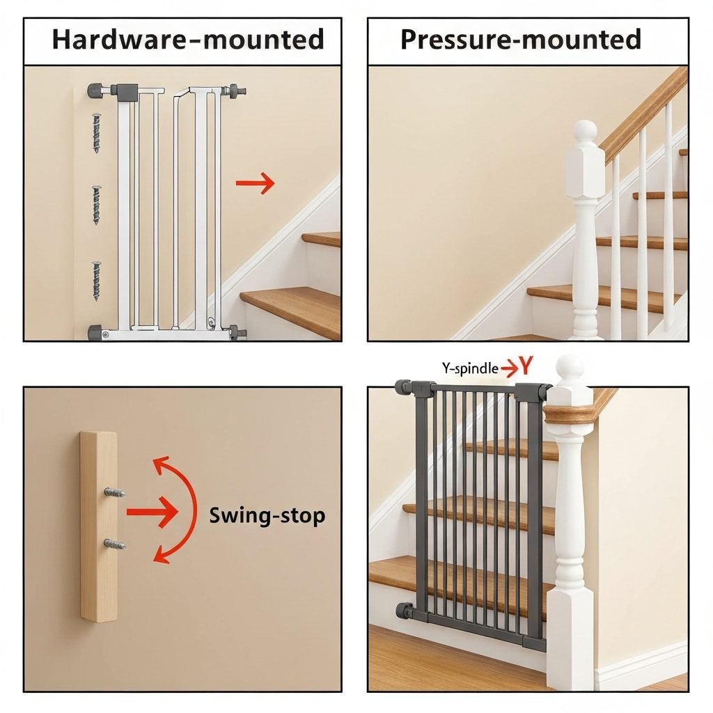 Safety Mandate: Only a hardware-mounted gate should ever be used at the top of a staircase. These gates screw into the wall (or a no-drill adapter) and are structurally more secure than pressure-mounted gates.