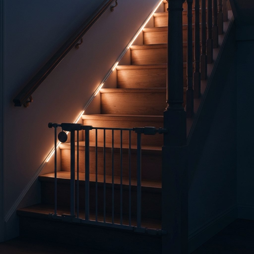 - Light the Way: A dark staircase is dangerous. Install nightlights in the hallways leading to the stairs and consider motion-activated LED strip lights along the baseboards or under the handrail for safe passage at night.