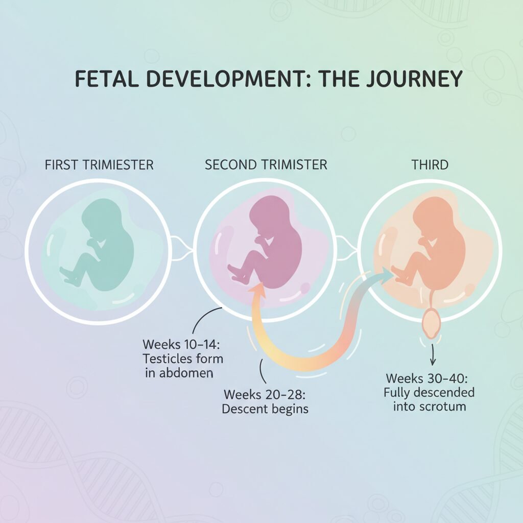 Here’s a mini biology lesson, parent-to-parent style. While your baby boy was growing in the womb, his testicles didn’t start out in the scrotum. They actually developed way up high in his abdomen, near his kidneys. In the last couple of months of pregnancy, they begin a slow and steady migration downwards, through a small tunnel-like passage, to their final destination in the scrotum.