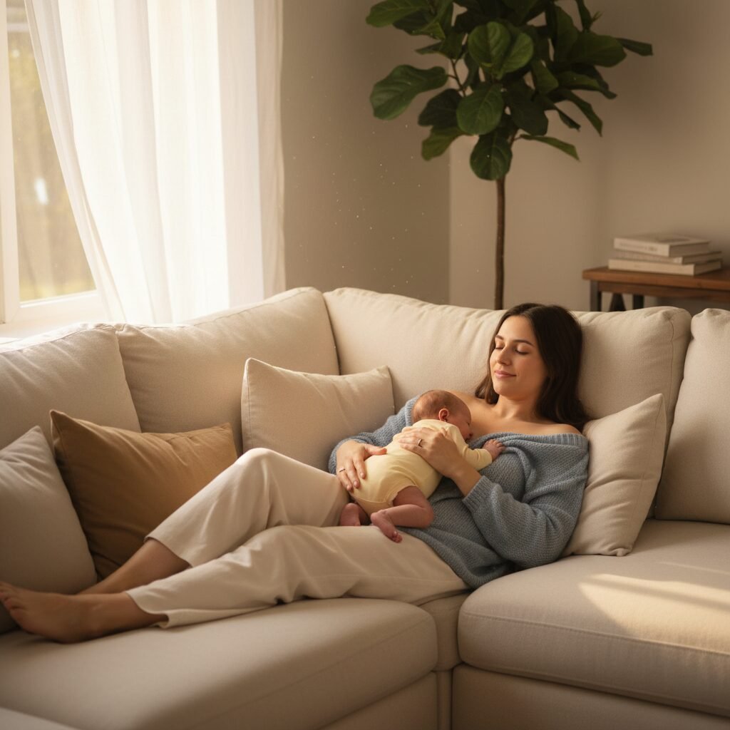 - Use Gravity to Your Advantage (Laid-Back Breastfeeding): This is a game-changer! Instead of sitting upright, lean back comfortably on a couch or bed with plenty of pillows for support. Place your baby on your chest, tummy-to-tummy, and let them find the breast. In this reclined position, your milk has to flow ‘uphill’ against gravity, which naturally slows it down. This also gives your baby more control over the latch and pace of the feed.