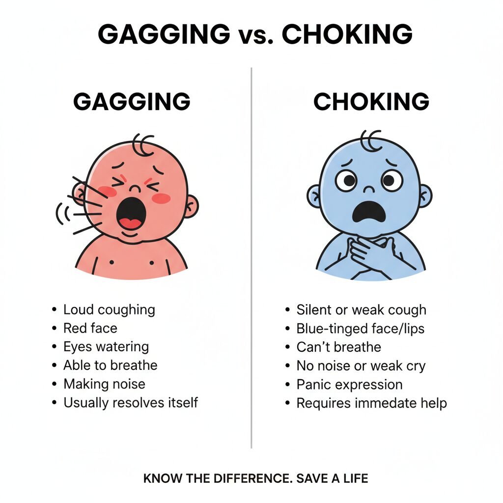 A gagging baby is a loud baby. A choking baby is a silent baby. If your baby is coughing, sputtering, or making noise, they are breathing. Their gag reflex is working perfectly to protect their airway.