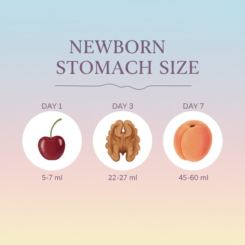 • Tiny Tummies: A newborn’s stomach is incredibly small at first. On day one, it’s about the size of a cherry and can only hold about 5-7 ml (a teaspoon!) at a time. It’s perfectly designed to digest your first milk, colostrum, which is packed with nutrients and antibodies in a small, concentrated volume.