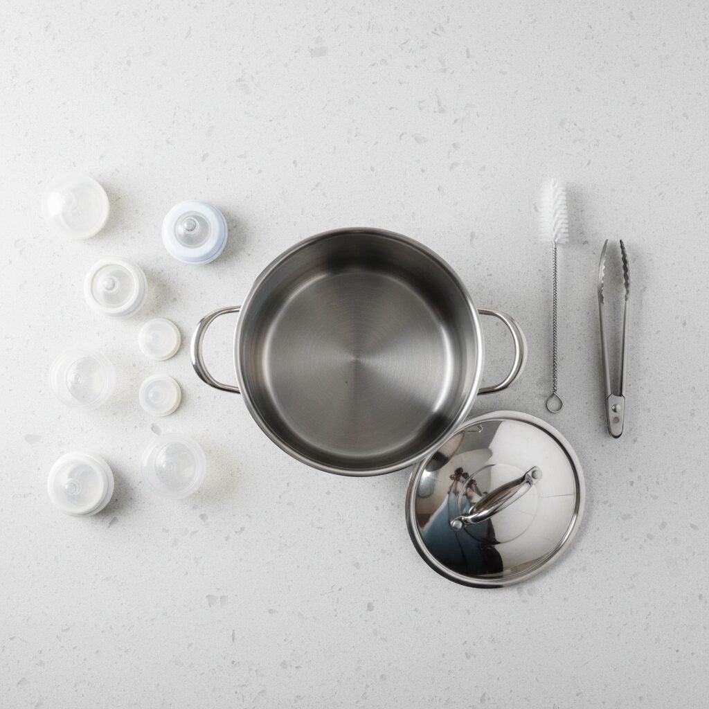 - A Large Pot with a Lid: This is your sterilizer! It should be large enough to completely submerge all the bottle parts without them being crammed together. Many parents find it helpful to have a ‘baby-only’ pot that they reserve just for this purpose, but as long as the pot is thoroughly cleaned, any large stockpot will do.