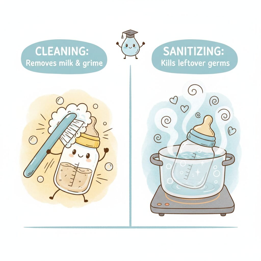 - Cleaning: This is the first and most important step. It involves using hot, soapy water and a bottle brush to physically scrub away milk residue and germs from all surfaces. You must clean items before you sanitize them. Sanitizing a dirty bottle is like spraying air freshener in a room without taking out the trash—it doesn’t solve the underlying issue.