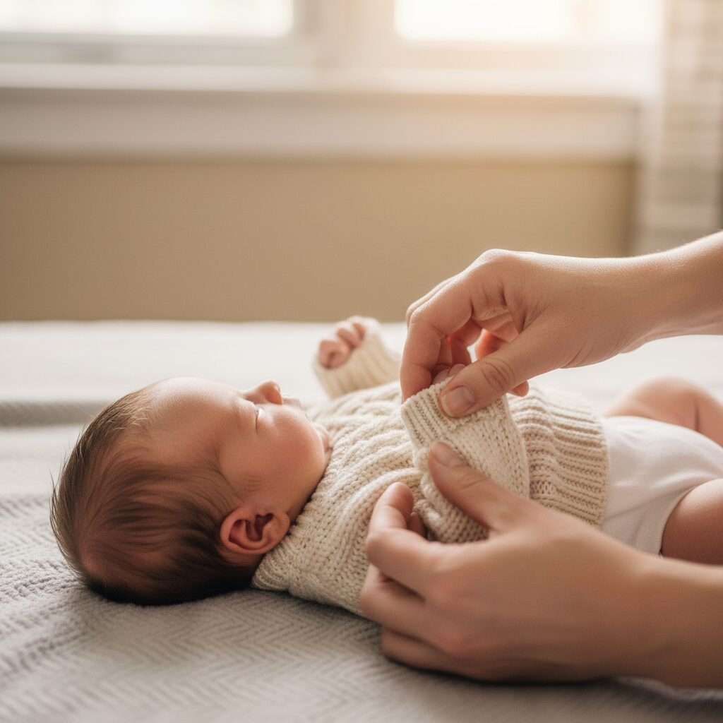 - Add a Layer: Put on a pair of socks, a onesie, or a light sweater. The ‘one more layer than you’ rule is a great guideline for dressing a baby.