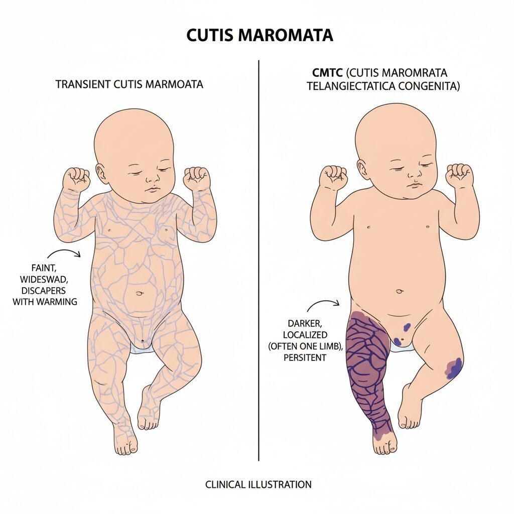 CMTC is a congenital condition, meaning it’s present at birth and is persistent—it doesn’t fade when the baby is warmed. The marbled pattern is often more pronounced, sometimes looks purplish-blue, and can occasionally be associated with skin thinning or ulcerations in the affected area. It also might affect just one side of the body or a specific limb.