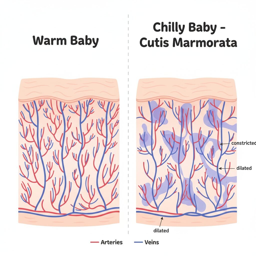 The reason this happens is fascinating! Newborns have an immature circulatory system. Their tiny blood vessels are still learning how to respond to temperature changes. When a baby gets a little chilly, the small blood vessels closest to the skin’s surface constrict (get narrow) to conserve heat. At the same time, other nearby vessels might dilate (widen). This uneven response creates that classic mottled pattern. It’s a visible sign of their body working to regulate its temperature.