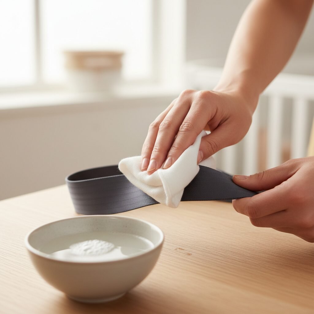 - ‘Rinse’ the Straps: Empty your bowl and refill it with clean, plain water. Take a new, clean cloth, get it damp with the plain water, and wring it out well. Wipe down the straps again to remove any soap residue.