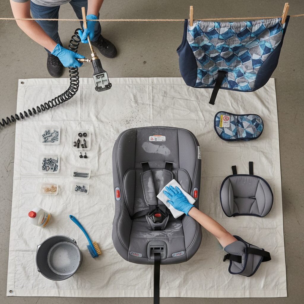 This is the easiest part! Simply use a damp cloth and a mild soap solution (the same one you used for the straps) to wipe down all the plastic components of the seat and the base. Use a cotton swab or a small brush to get into the nooks and crannies. Wipe it down with a cloth dampened with plain water to rinse, and then dry it with a towel or let it air dry.