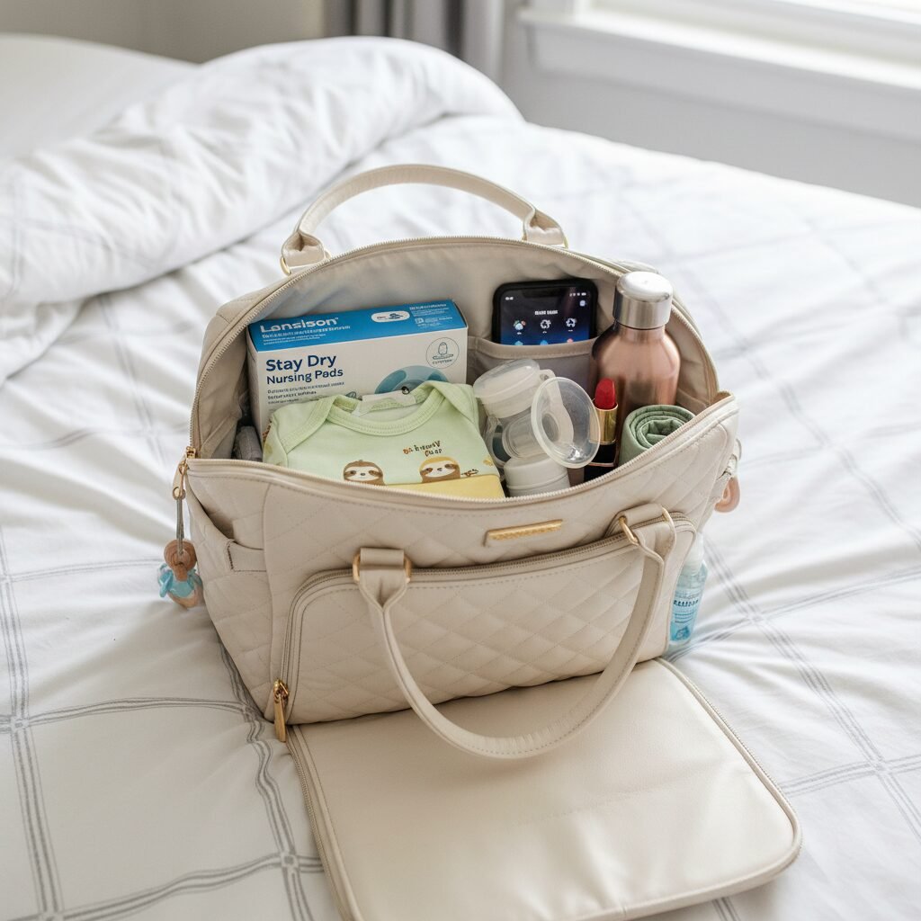 You’ll need a bag that’s a bit larger than your pre-baby clutch. Look for a stylish tote or a structured satchel that’s big enough to hold nursing pads, a bottle of water for you (hydration is key!), your pump if you need it, and a muslin cloth for any spills. Many brands now make ‘diaper bags’ that look like designer purses.