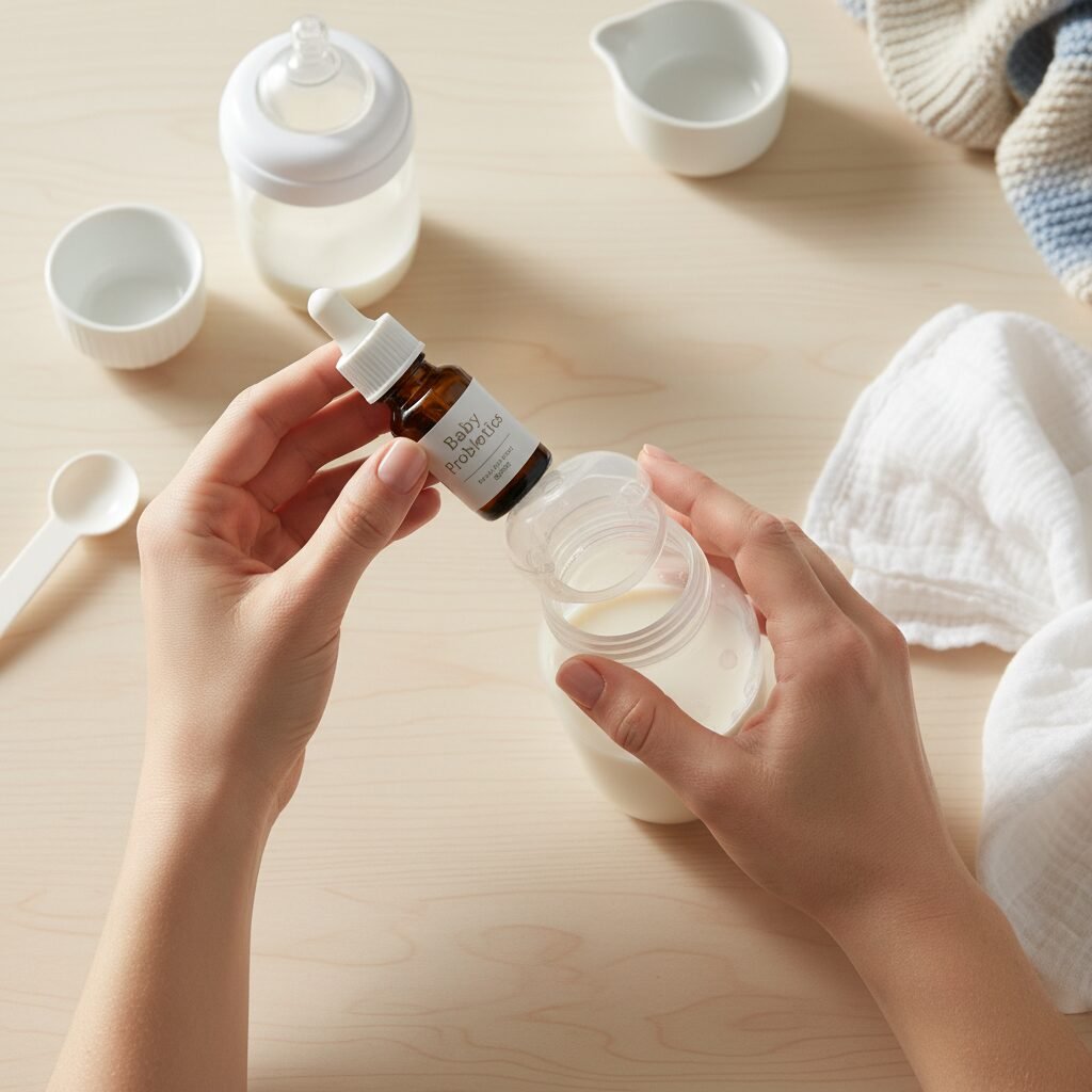 Giving probiotics is usually simple. You can add the powder or drops to a bottle of cool or lukewarm expressed breast milk or formula. Never add it to hot liquid, as this can kill the live bacteria. For breastfed babies, you can also place the drops directly on your nipple just before a feeding or put them on a clean finger for your baby to suck off.