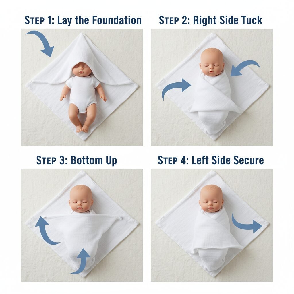 Okay, let’s get practical. For this, you’ll want a large, lightweight, and slightly stretchy swaddle blanket (around 47×47 inches is ideal). Forget the small, flannel receiving blankets for this job—they are the leading cause of Houdini escapes! Here is my go-to, escape-proof method: