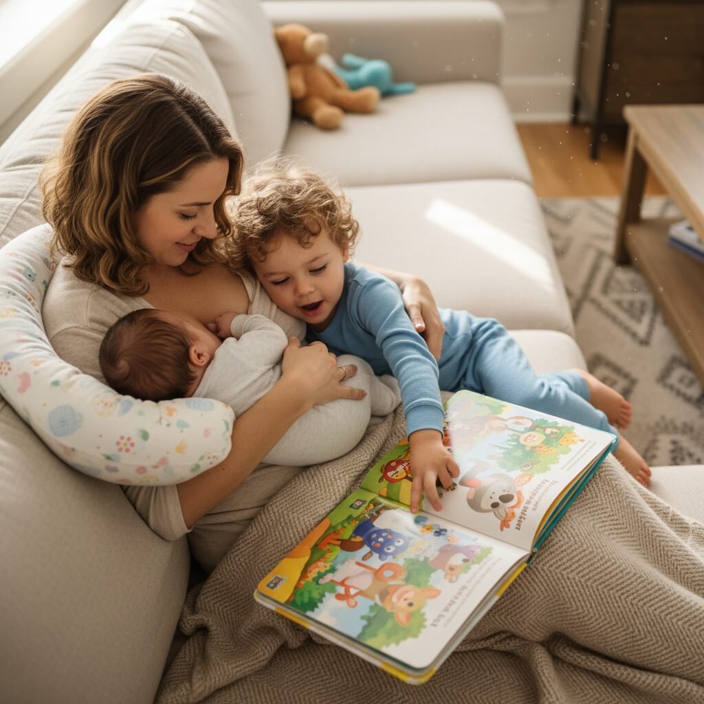 - Snuggle and Read: This is a classic for a reason. Prop the baby on a nursing pillow, and invite your toddler to snuggle up on your other side with a pile of books. You can read to them, or they can ‘read’ to you and the baby. It reinforces the idea that this is family time.
