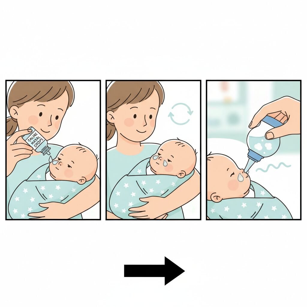 - Step 1: Assemble Your Toolkit. Get everything ready before you get the baby. You’ll need your nasal aspirator (clean and ready to go), a gentle saline spray or drops for infants, and a soft burp cloth or tissue for cleanup. A calm environment helps, so maybe put on some soft music.