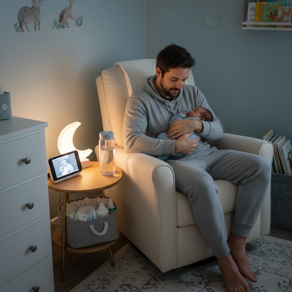 - One-Handed Snacks and a Giant Water Bottle: When you’re holding a sleeping baby, you’re effectively pinned down. Stock a basket near his ‘dad chair’ with snacks he can eat with one hand, like granola bars, nuts, or protein bars. A large, reusable water bottle with a straw lid is also essential for staying hydrated.