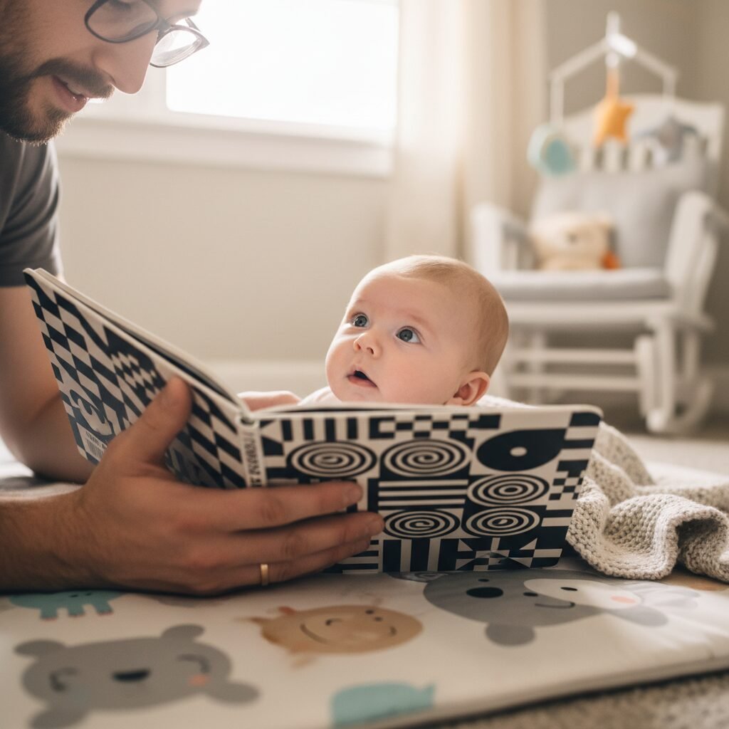 - High-Contrast Board Books: A newborn’s vision is still developing, and they are captivated by simple, high-contrast images (like black and white patterns). ‘Reading’ these books to the baby is a wonderful, simple way for dad to interact and bond from the very beginning. It’s less about the story and more about the sound of his voice and the shared focus.