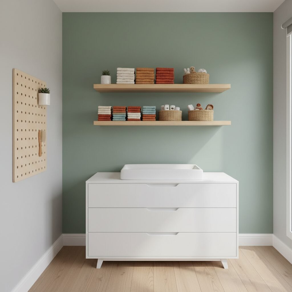 • Floating Shelves: Install one or two shelves a safe distance above the changing table. This is the perfect spot for things you don’t need mid-change but want nearby. You can use them for cute baskets holding socks or hats, extra swaddles, or even a few decorative items to make the space feel joyful. Safety first: Ensure shelves are properly installed into studs and don’t place heavy items directly over where your baby’s head will be.