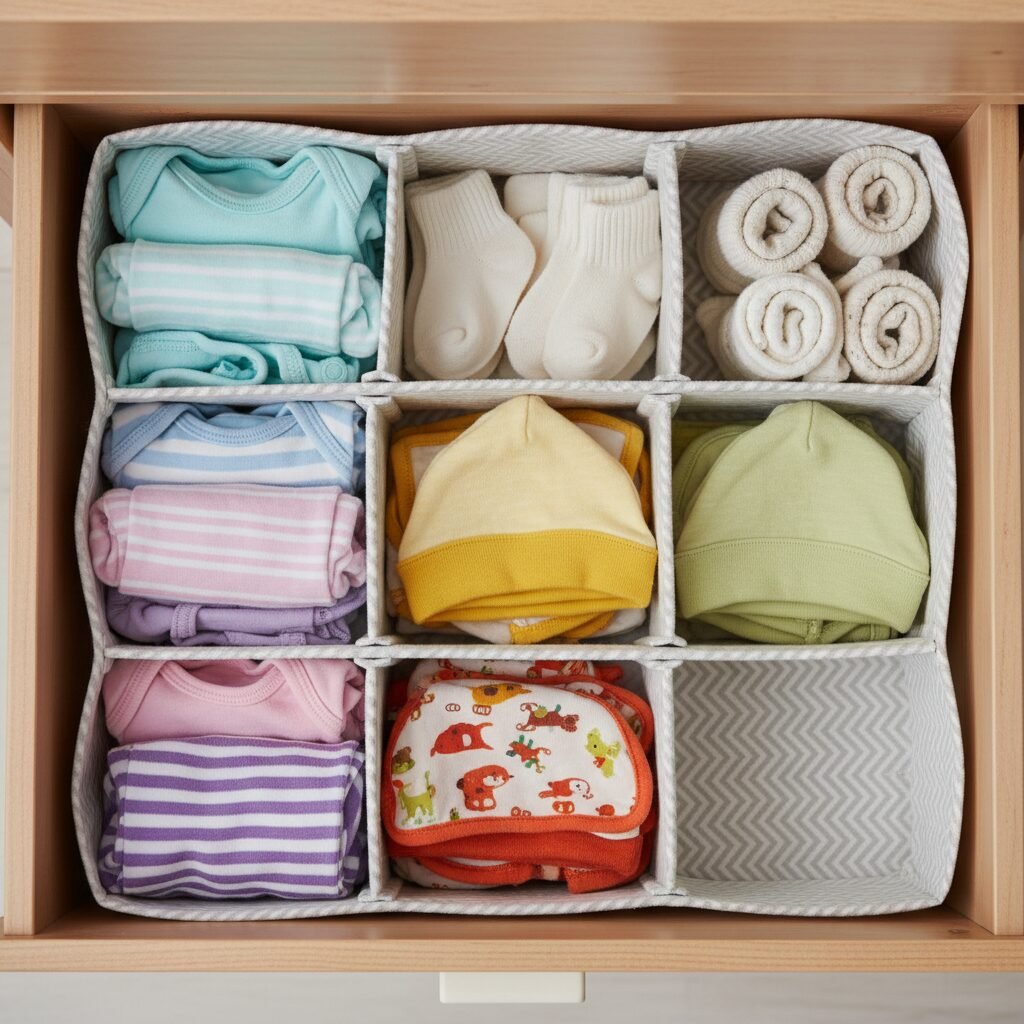 • Drawer Dividers: These are non-negotiable for baby clothes. Use simple tension-rod dividers or honeycomb-style inserts to create specific spots for rolled onesies, pajamas, socks, and hats. When you can see everything at a glance, you’ll save precious time and sanity during those 3 a.m. outfit changes.