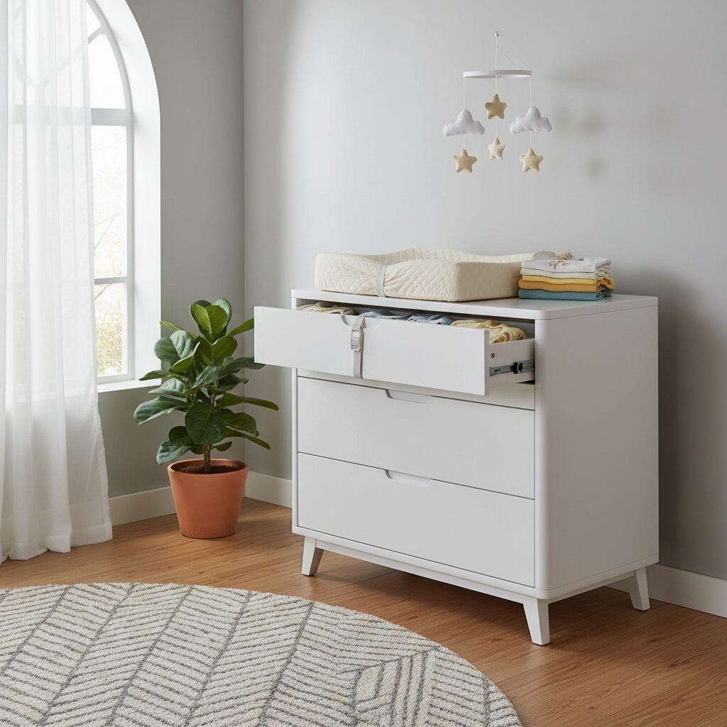 Dresser with Topper Excellent storage, long-term use (becomes a regular dresser later), very sturdy. Larger footprint than other options, can be a bigger initial investment.