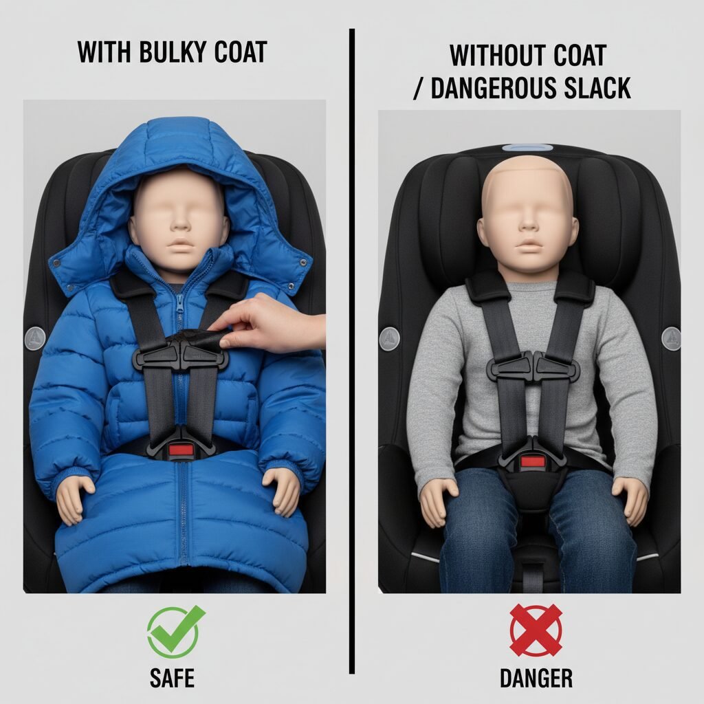 Imagine you’re wearing a very thick, puffy jacket and you put on your seatbelt. It clicks, and it feels tight against the jacket. But in a crash, all the air and puff in that jacket would instantly compress, leaving a huge gap between you and your seatbelt. The seatbelt would no longer be holding you securely. The exact same thing happens with your child’s car seat harness.
